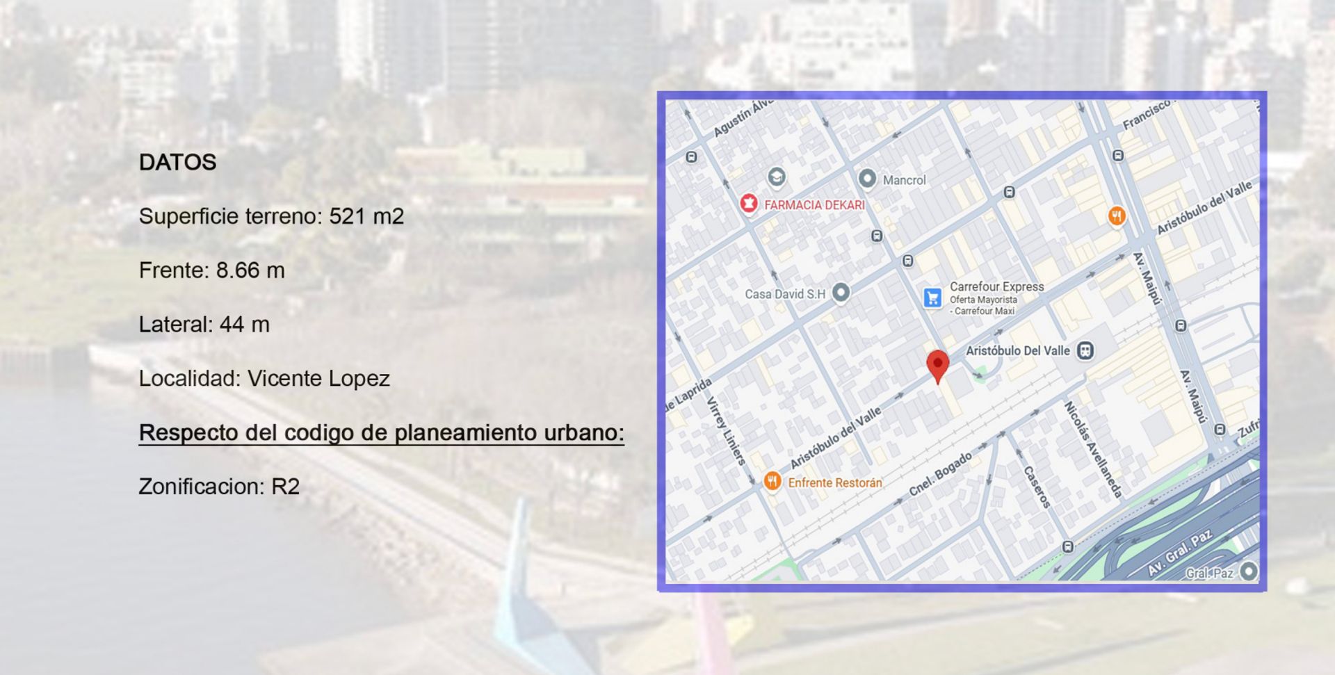 Superficie terreno: 521 m2 Frente: 8.66 m Lateral: 44 m Localidad: Vicente Lopez Respecto del codigo de planeamiento urbano: Zonificación: R2